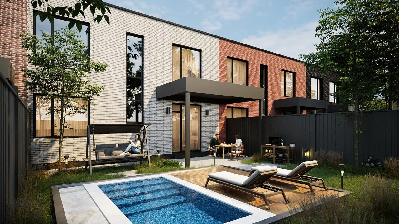 Каждый таунхаус представляет собой двухэтажное здание площадью от 109 до 143 м². В зависимости от выбранной планировки в доме предусмотрено 3–4 спален, что идеально подходит для больших семей
