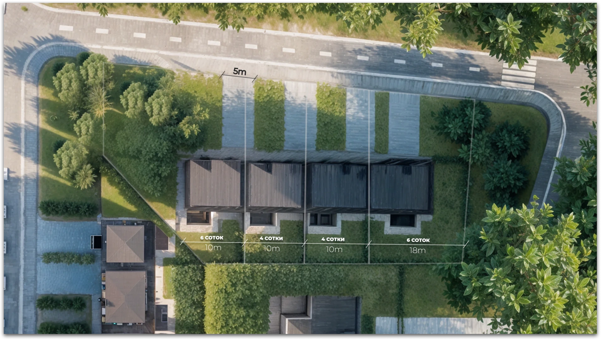 Все дома включают в себя единый забор высотой 1,8 м. Места общего пользования благоустроены: организовано озеленение перед домами, включающее высадку декоративных растений. Кроме того, у каждого таунхауса предусмотрены два парковочных места перед домом